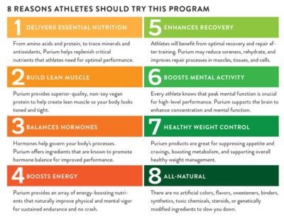 I started the Purium 10-Day Transformation to improve the functioning of my cells. Touted as a weight loss transformation, the supplement set is also highly beneficial for athletes and those looking to build up their nutritional foundation. I like the Super Meal shake because it is a whole food (aka: real food) shake that gets absorbed quickly and easily. In addition, it contains a beautiful array of body-balancing and supportive superfoods. Spirulina, a nitric oxide-based blue green algae, is nutrient and energy-dense, as well as contains a nearly complete array of amino acids and is ideal for those working out hard. Besides providing energy and focus, spirulina helps to rebalance blood pressure & cholesterol. It is the most protein-dense food by weight (71%, compared to chicken, which is only 30% protein by weight). The Purium 10-Day Transformation and the new version specifically for athletes is also loaded with:- Chlorophyll (Blood-builder)