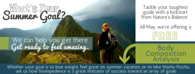 What do your summer plans entail? Let us know how we can help. Throughout the month of May, we’re offering a FREE Bioimpedence Analysis (BIA) to measure your body’s composition and preparedness for a challenge. It’s a great baseline measurement that will help get you started on the right track. Give us a call to schedule your complimentary session at (815) 788-8383.